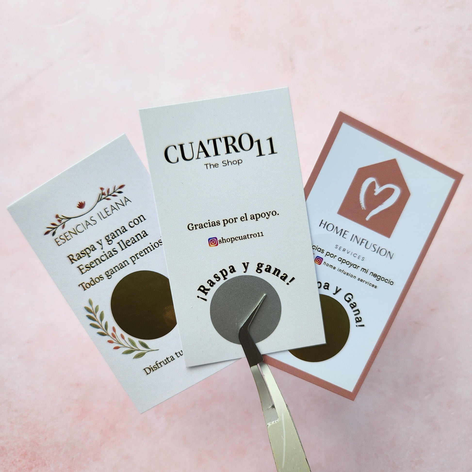 Estas tarjetas raspa y gana elevan la experiencia de compra de tus clientes, ¡haciendo que recibir su pedido sea aún más emocionante! 🎁
